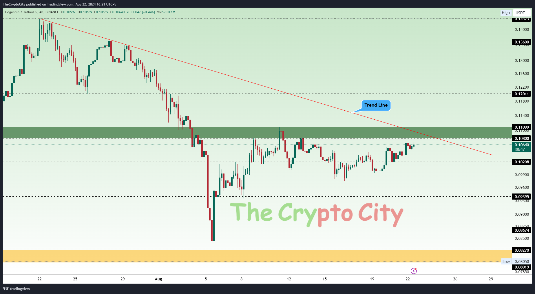 Dogecoin (DOGE) has been consolidating after a significant decline from the $0.14373 level down to a low of $0.08019. The price is currently hovering around the $0.10587 mark, just below the resistance zone (Green) at $0.10800 – $0.11099, with the downward trendline still intact.